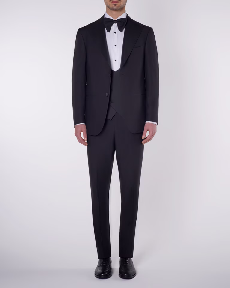 کت و شلوار و ژیله دامادی S212 یقه پیک ساتن مشکی