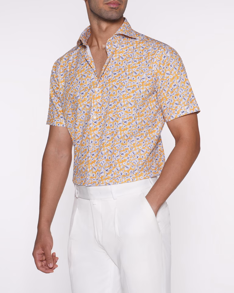 پیراهن PS16 یقه بک زرد طرح گل سفید