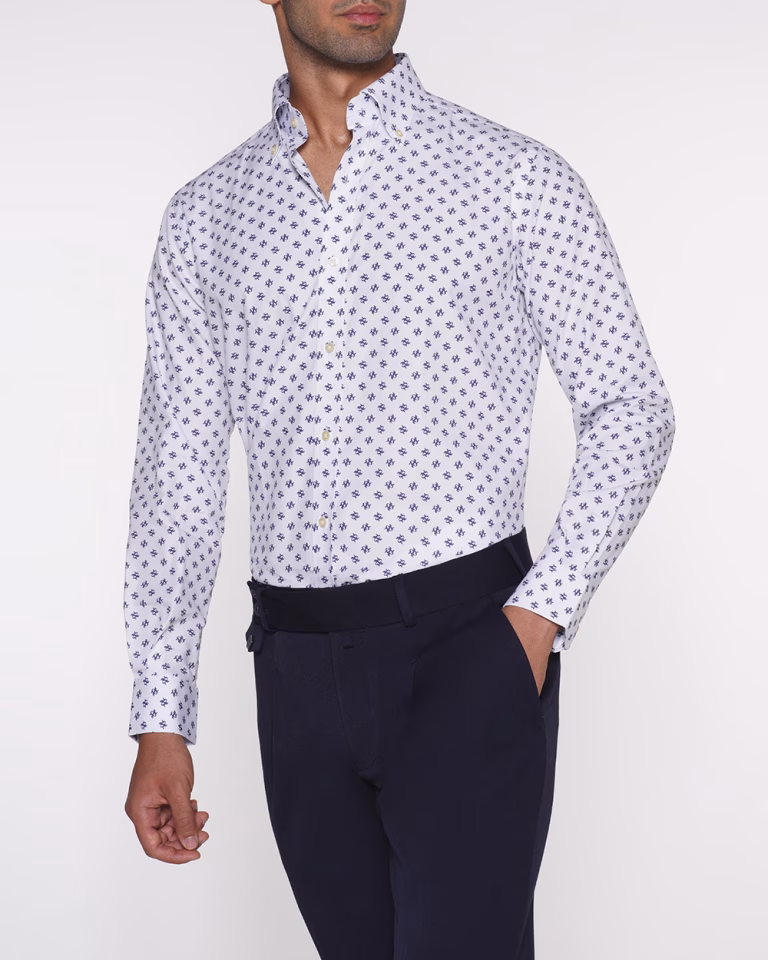 پیراهن P276 یقه دکمه دار طرح دار سفید سورمه ای