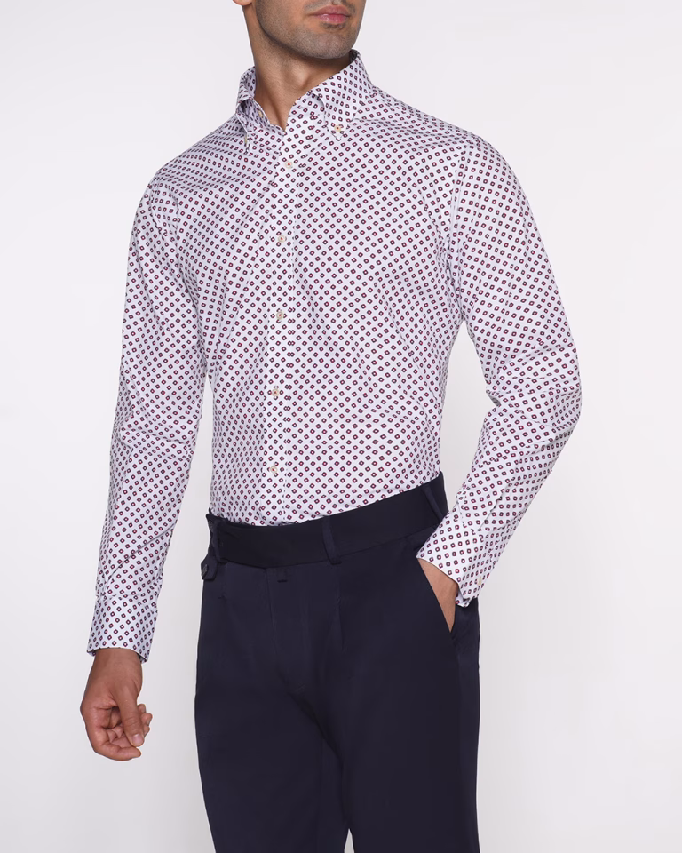 پیراهن P268 طرح دار سفید سورمه ای قرمز یقه دکمه دار
